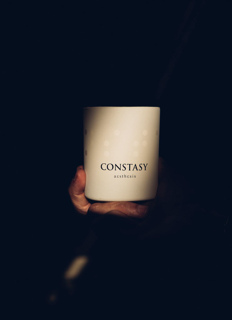 A luxurious candle with the CONSTASY “aεsthεsis” signature scent. In a specially-processed glass container with a logo in braille language.