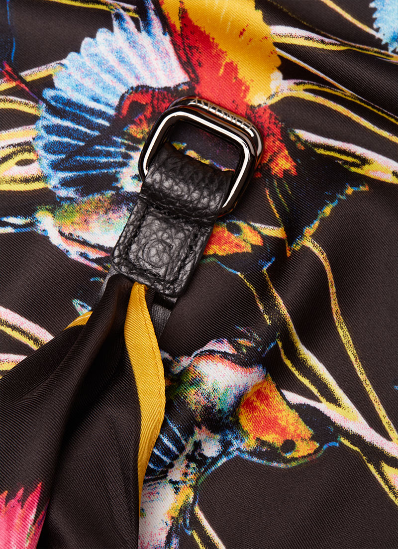 Measuring a generous 130 x 130cm, the Avian Kaleidoscope Silk Scarf invites you to embrace the beauty of nature’s kaleidoscope. Let its exquisite craftsmanship and captivating print, complemented by the unique leather ending, be the perfect accessory to express your individuality and style.