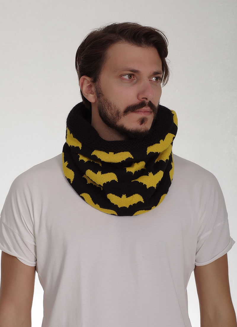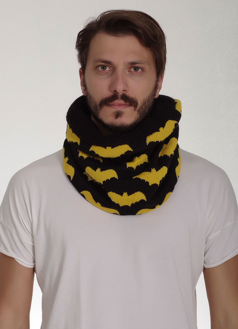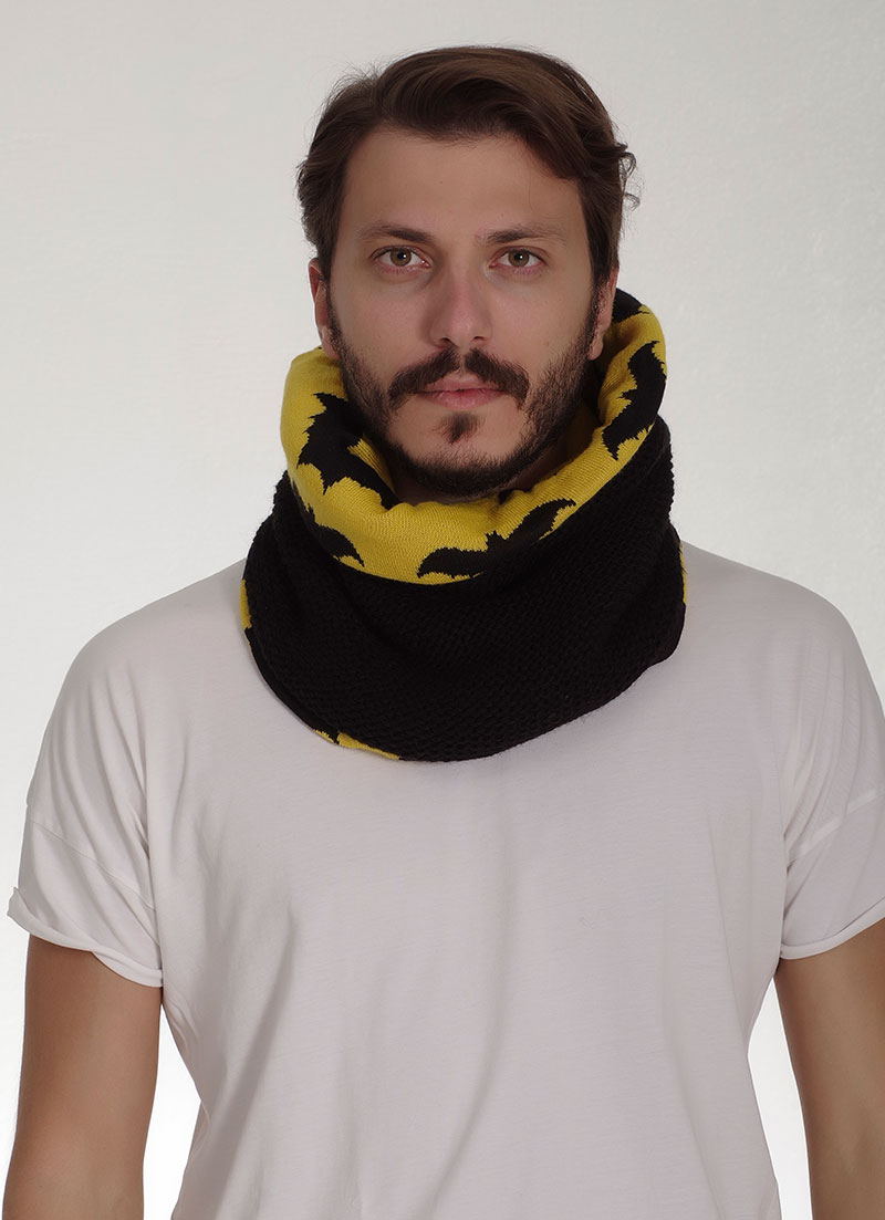 Elevate your winter style with our Bat-Knitted Pattern Snood. This uniquely crafted double-sided snood showcases an intriguing knitted pattern featuring bats that adds a touch of mystique and whimsy to your cold-weather ensemble. The bats in the knitted pattern create a unique and captivating texture. The interior is adorned with a vibrant yellow-black color scheme, providing a striking contrast and warmth with black wool lining.