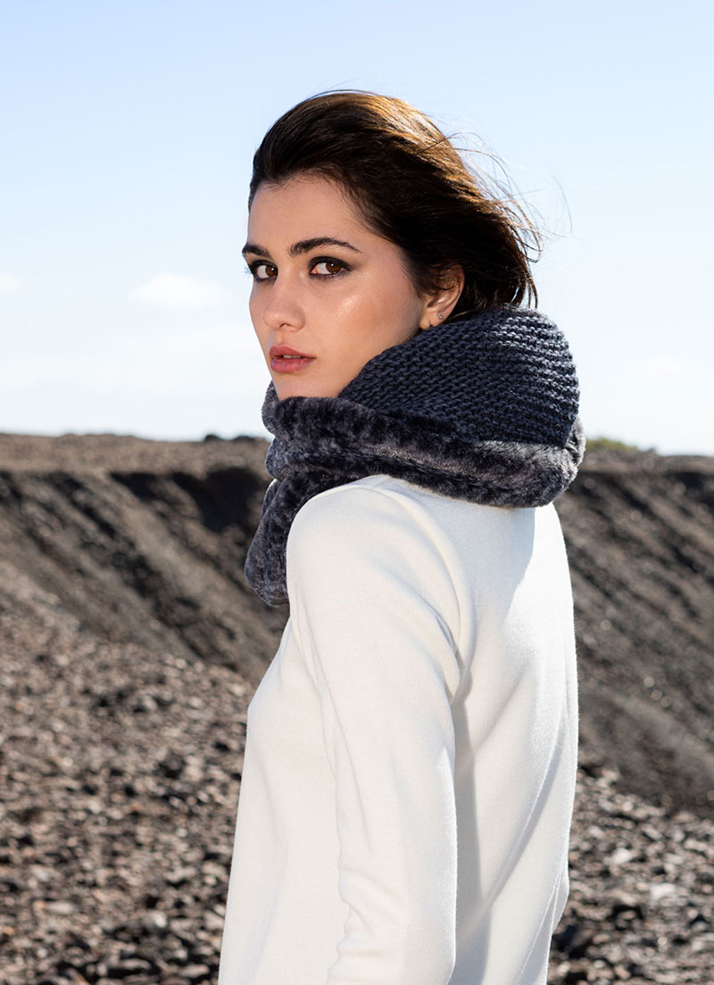 Elevate your winter style with our Blue / Gray Delight Eco Fur Snood. This uniquely crafted double-sided snood features a harmonious blend of blue and gray eco fur, creating a cozy and stylish accessory that will delight your senses. The interior is lined with plush gray wool for ultimate warmth and comfort.