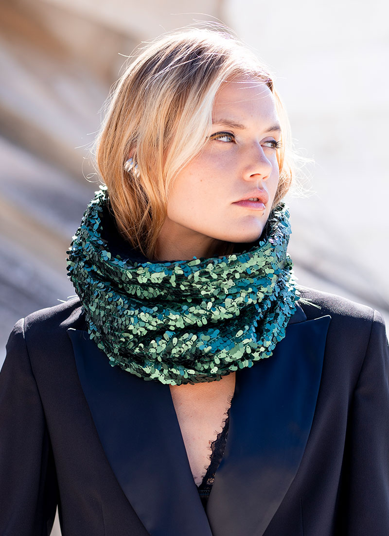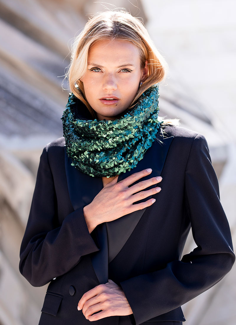Elevate your winter style with our Emerald Metallic Snood. This uniquely crafted double-sided snood features emerald-colored metal details on one side, exuding a touch of sophistication and luxury. On the reverse side, you’ll find cozy black wool for ultimate comfort. It’s a must-have addition to your cold-weather collection.