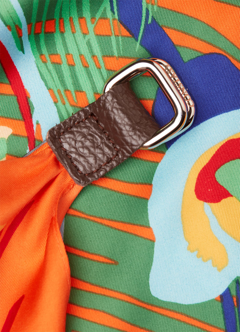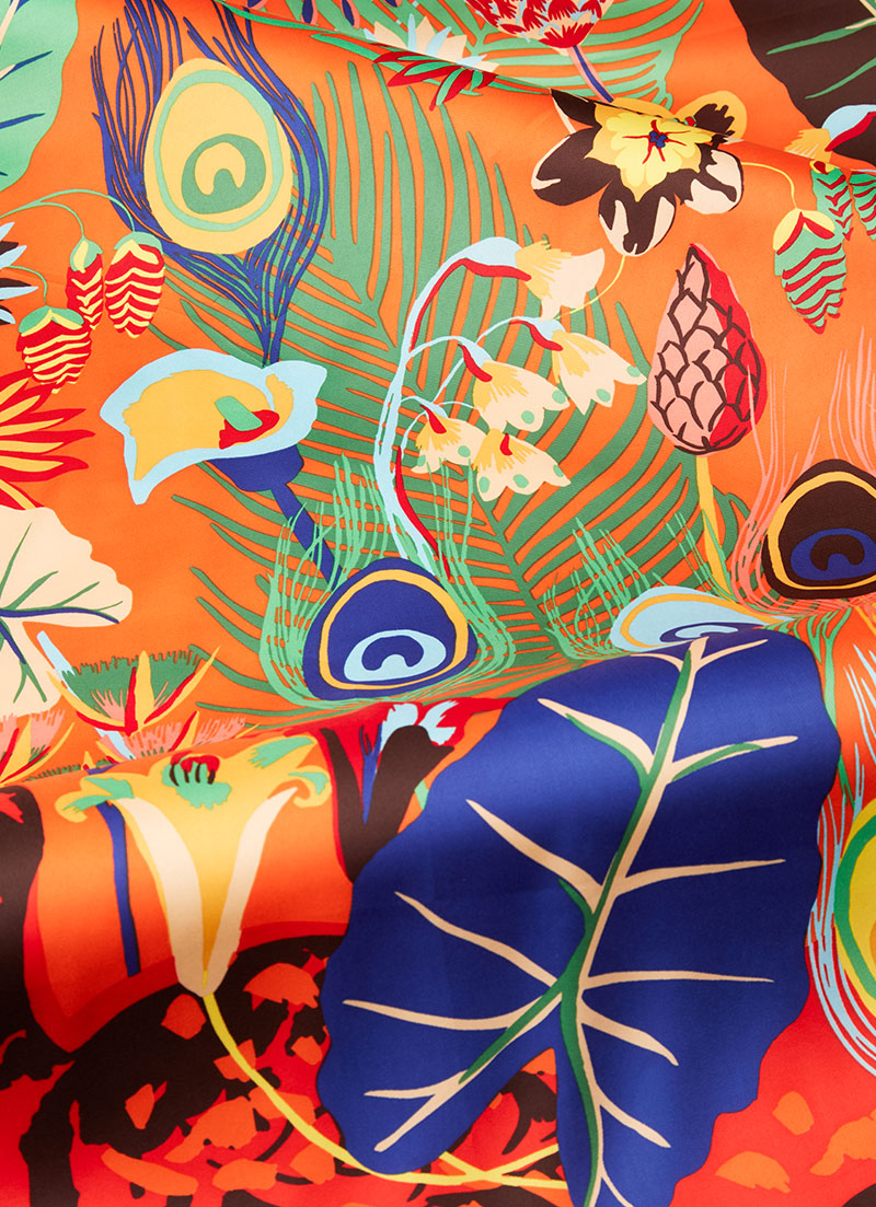 Introducing the Orange Grove Peacock Silk Scarf, a stunning homage to the majestic beauty of peacocks amidst a flourishing orange grove. Crafted from opulent silk, this scarf features a captivating print adorned with resplendent peacock feathers against a backdrop of vibrant orange blossoms, exuding grace and sophistication. Enhancing its allure, the Orange Grove Peacock Silk Scarf is adorned with a leather ending, offering both refinement and functionality. This unique detail allows for versatile styling options, whether draped elegantly around your neck, tied as a headscarf, or worn as a chic belt, enabling you to express your regal elegance with effortless style. The possibilities are as abundant as the grove itself.
