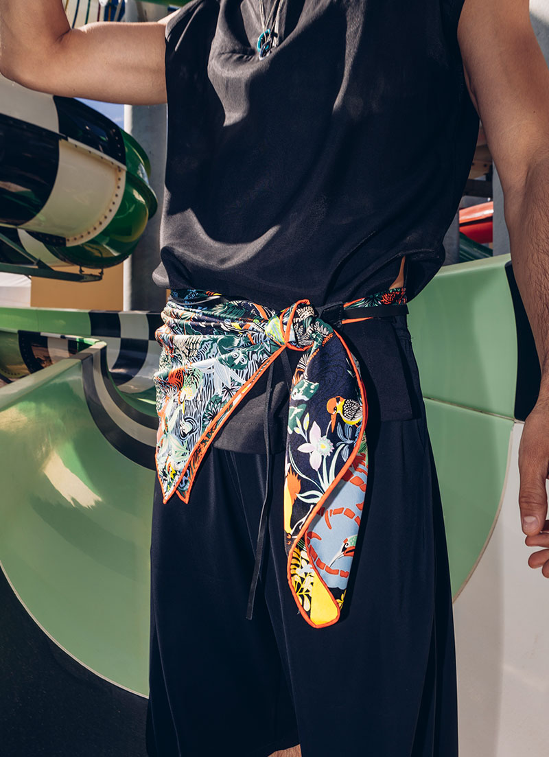 Introducing the Orange Jungle Royalty Lion Silk Leather Belt, a vibrant tribute to the majestic beauty of the wild. Crafted from luxurious silk twill, this accessory features an enchanting lion print set against a striking orange background, exuding strength and elegance. With its hand-rolled edges and leather stripe, the Orange Jungle Royalty Lion Silk Leather Belt boasts artisanal craftsmanship and refinement. This unique blend of silk and leather adds a touch of luxury to any ensemble, making it the perfect accessory to elevate your style.