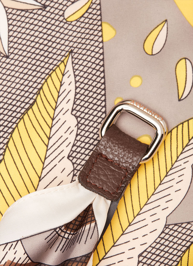 Introducing the Radiant Solar Bloom Silk Scarf, a vibrant celebration of nature’s efflorescence. Crafted from luxurious silk, this scarf boasts a captivating print inspired by the resplendent bloom of solar flowers, radiating warmth and vitality. Embodying the essence of natural beauty, the Radiant Solar Bloom Silk Scarf is adorned with a leather ending, offering both sophistication and functionality. This unique detail allows for versatile styling options, whether draped elegantly around your neck, tied as a headscarf, or worn as a chic belt, enabling you to express your connection to nature with effortless style. The possibilities are as radiant as the sunlit petals themselves.