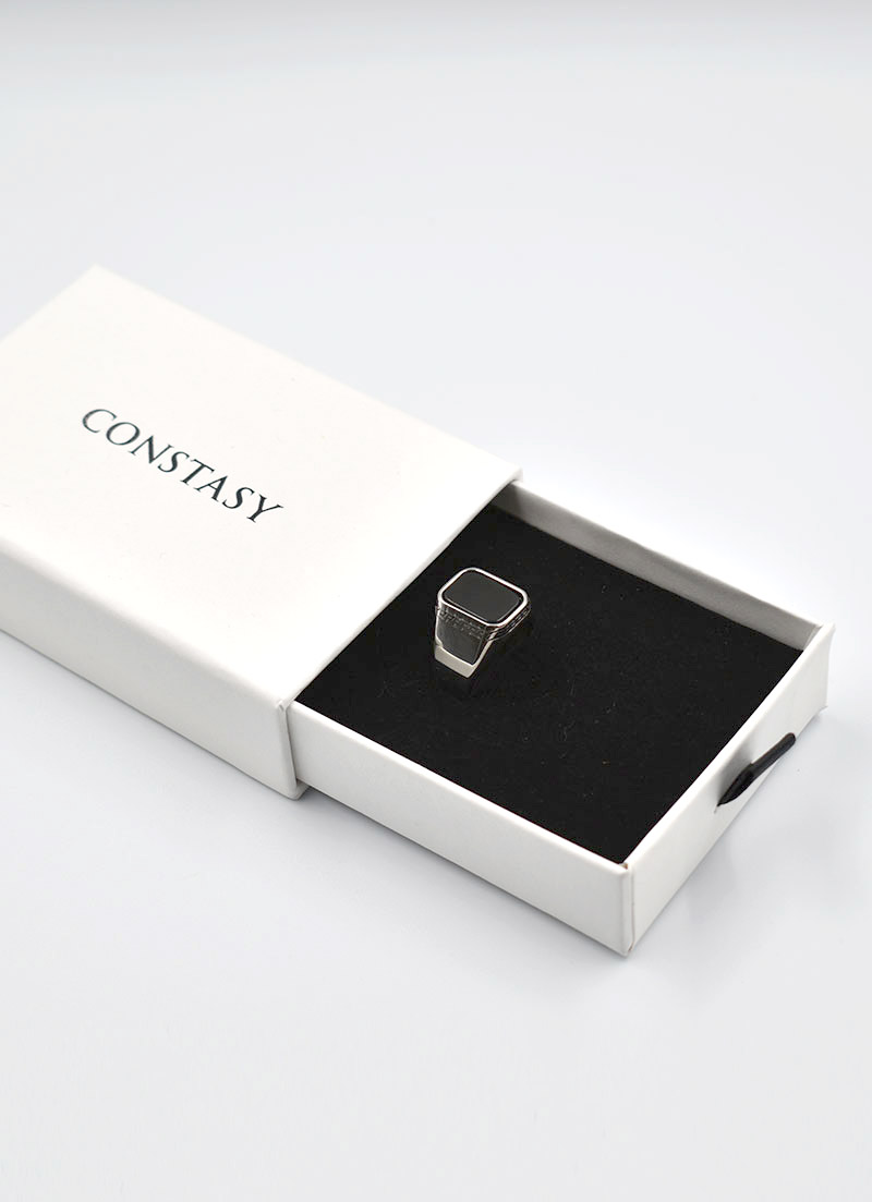 The Royal CONSTASY ring is a symbol of power, wisdom, and immortality. The design is simple and elegant, with carved details around them black stone.