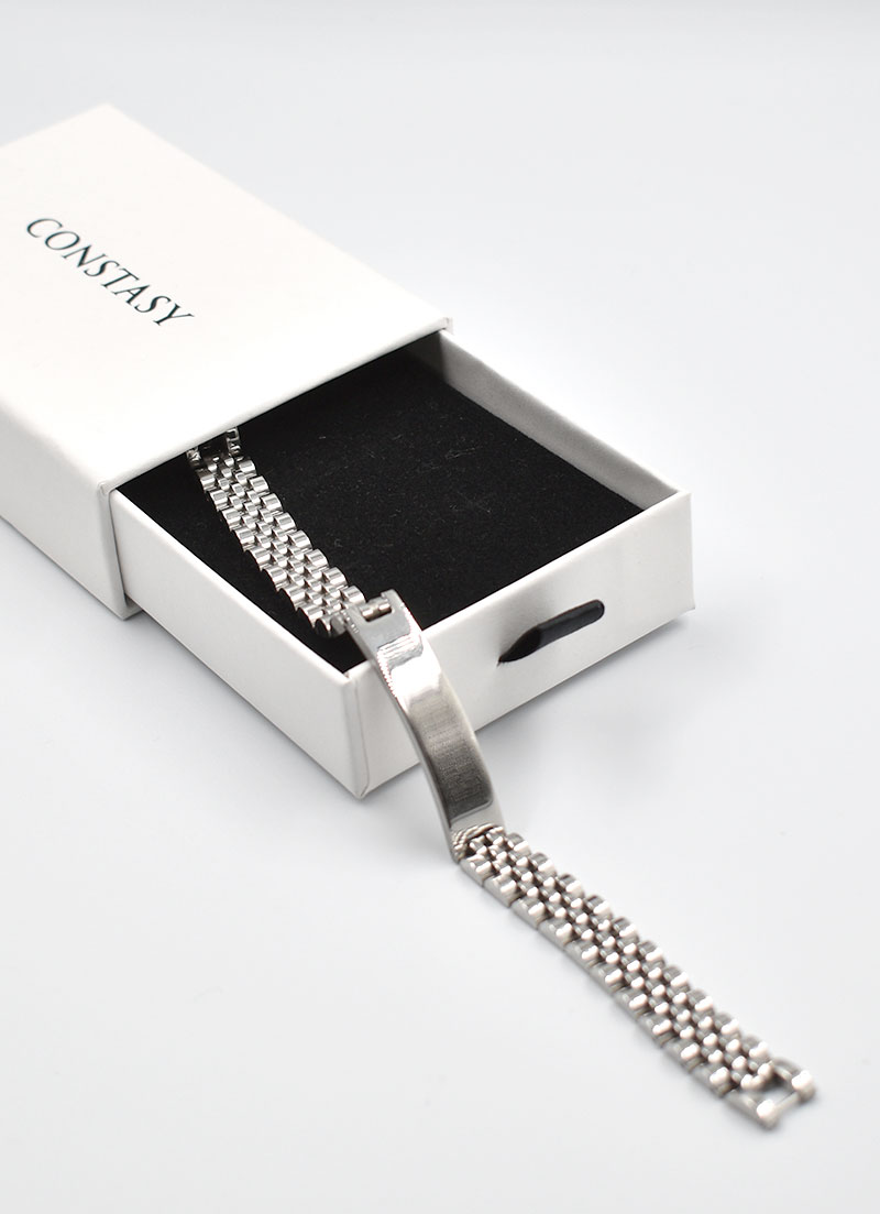 The CONSTASY strap bracelet id is definitely a statement piece with a 10mm chain, featuring engraved logo, chain-link detailing and clasp fastening, also 3 links can be removed easily like your watch!