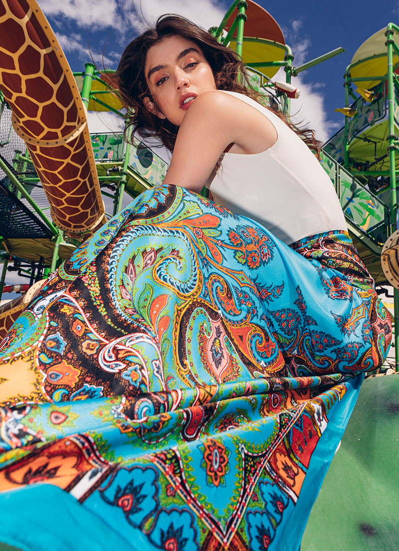 Introducing the Tribal Blue Odyssey Silk Scarf, a captivating journey through tribal motifs and oceanic hues. Crafted from luxurious silk, this scarf features an enchanting blend of tribal patterns in mesmerizing shades of blue, evoking the spirit of adventure and discovery. Accentuating its allure, the Tribal Blue Odyssey Silk Scarf is adorned with a leather ending, offering both sophistication and versatility. This unique detail allows for endless styling possibilities, whether draped elegantly around your neck, tied as a headscarf, or worn as a chic belt, allowing you to express your style with effortless flair. The styling possibilities are as vast as the open seas.