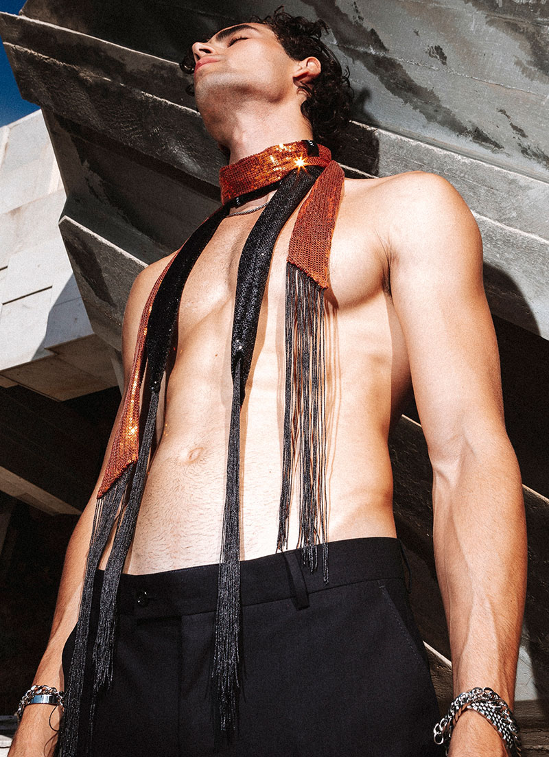 The deep, alluring black sequins dance across the twill fabric, creating a captivating visual tapestry that captures attention and light in equal measure. The addition of black fringes adds an element of charm and movement, making this accessory not just stylish but also delightful to wear.